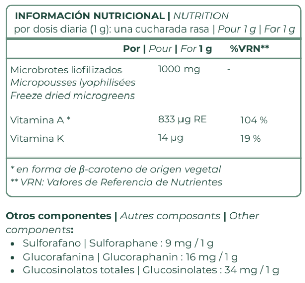 Complemento alimenticio a base de microgreens liofilizados (microbrotes), naturalmente ricos en nutrientes y sulforafano, seleccionados por su perfil nutricional.